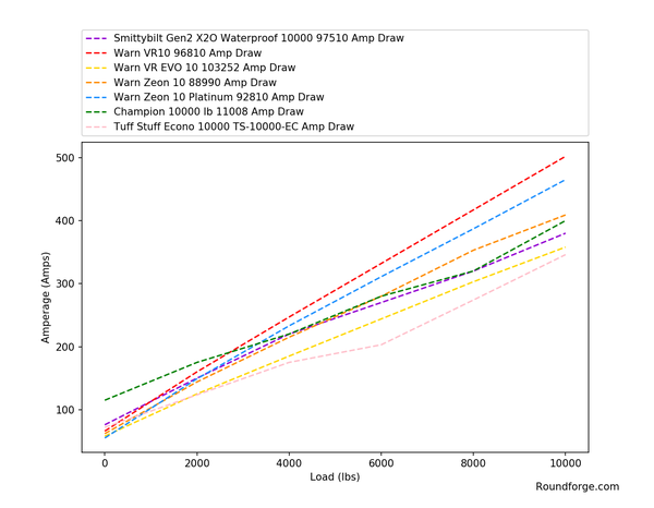 The Warn VR EVO draws 358A, the Smittybilt X2O draws 380A, and the Champion draws 400A. It's worth noting that these would all be considered "budget" winches. They are all generally less expensive and are fine for casual winching.
