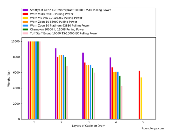 The Smittybilt X2O 10000 winches lose the least amount of power. At 4 layers on the drum, the Smittybilt is still pulling 7950 lbs. Warn's winches all generally have around the same power loss, so that the Warn VR EVO 10, Zeon 10, and Zeon 10 Platinum all are pulling 6103 lbs with 4 layers on the drum.
