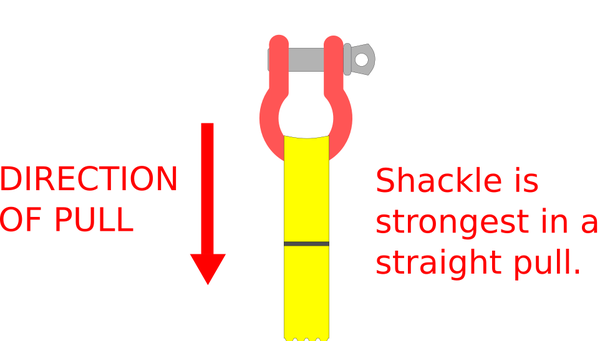 This is especially true for shackles that are side-loaded - rigging manufacturers generally expect that you'll use a shackle in a straight line, or with two equally distributed pulling points that don't exceed 120 degrees between them.