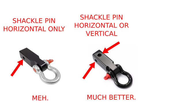You can mount the shackle so that the pin is horizontal or vertical. There aren't a lot of 2.5" Class V shackle hitches available, so this is a rarity.